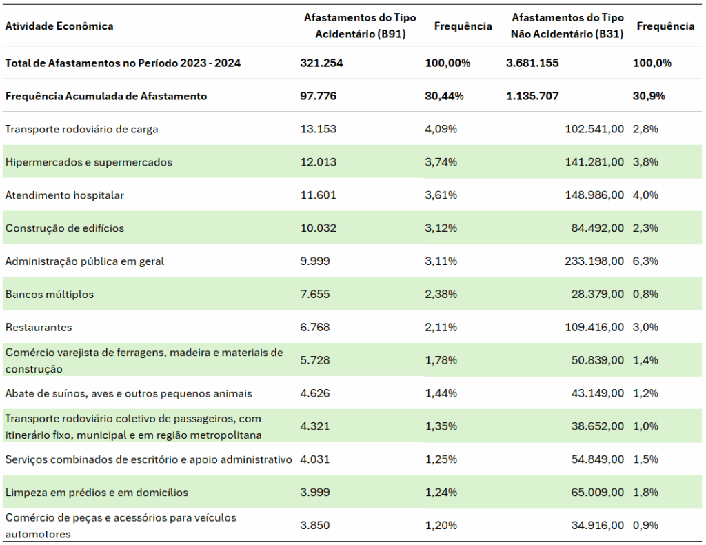 Dados do Observatório de Segurança e Saúde no Trabalho (SmartLab), demonstram as 15 atividades econômicas com mais afastamentos, no período de 2023 e 2024, conforme os tipos de doenças ocupacionais. Levantamento que permite identificar as tendências dos ambientes de trabalho que são obrigados a realizar frequentemente exames de retorno ao trabalho.